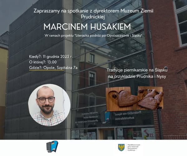 Dzisiaj w Centralnej Bibliotece Josepha von Eichendorffa w Opolu w ramach projektu „Literacka podróż po Opolszczyźnie i Śląsku” odbędzie się spotkanie z kol. Marcinem Husakiem z Klubu Przewodników Turystycznych i Pilotów Wycieczek Woj. Opolskiego PTTK, które będzie poświęcone tradycjom piernikarskim na Śląsku na przykładzie Prudnika i Nysy.