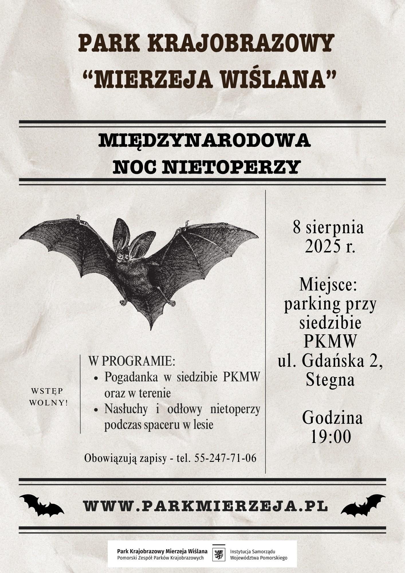 Pracownicy Parku Krajobrazowego „Mierzeja Wiślana” we współpracy z Pracownikami Wdzydzkiego Parku Krajobrazowego zapraszają na warsztaty terenowe z okazji Międzynarodowej Nocy Nietoperzy.
